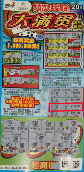 小刘(化名)是个刚毕业不久的大学生,买彩票纯属休闲娱乐,接触彩票也就是这一两年的时间,但对顶呱刮系列情有独钟,尤其是20元票更是每次都要刮上几张。“这个纯属运气,也不用费尽心思研究数字,平时中点小奖也挺开心的,谁知这次居然中了10万元!我真是太幸运了!”小刘如是道。当时小刘买了5张大满贯,想着正好赶上有活动,要是能中个200元以上的奖再多拿100元彩票就好了,谁知刮到第三张就刮出了10万元!在销售员的确认下,小刘总算相信了自己的眼睛,第二天就赶紧来到体彩中心领奖,还发生了一个小小的插曲——差点没拿赠送的100元彩票,“捡了西瓜也不能丢了芝麻呀!”我们笑道。