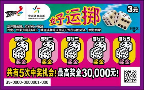 “好运掷”是顶呱刮最新3元票种,一张彩票有5次中奖机会,最高奖金是3万元。该票种的玩法也是非常简单,五场游戏的奖金都藏身“骰子”覆盖膜之下,刮开覆盖膜,在任何一场游戏中,如果号码是6或8,就可以赢得该号码下方所示的奖金。由于“好运掷”音同好运至,所以相信该票种一定能够给大家带来好运。