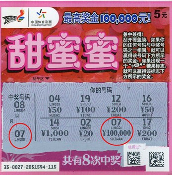 据宋先生说,他之前还中过七位数3000元,即开票也过几次几百元,这次是中得的最高奖金,自己的坚持终于圆了大奖梦。以粉色和红色为主的“甜蜜蜜”,在它那布满整个票面的心形图案中,除了充满着温馨和浪漫的气息之外,还有亲情、友情以及对美好生活的憧憬……而此款彩票的玩法和其它顶呱刮即开型体育彩票系列一样:您的号码与中奖号码一致即算中奖,这个过程只需要刮开彩票、简单比对即可,实在是一个简单有趣的玩法!大家不妨在闲暇之余刮上几张,在奉献爱心之时,说不定还会像这位幸运彩民宋先生一样中得大奖。