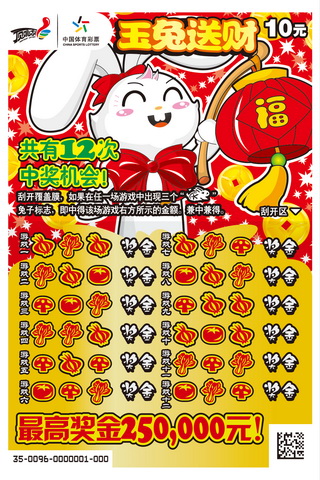 “玉兔送财”的票名很容易让大家想起近两年顶呱刮推出的新年贺岁票种“金牛报春”和“锦虎送福”,没错,“玉兔送财”正是顶呱刮为迎接兔年来临而推出的。“玉兔送财”票种3张为一个套系,有红、黄、蓝三种不同的票面背景色,活泼可爱的小兔子和富有中国传统特色的鞭炮、灯笼、对联等图案给票面带来了勃勃生机。该票种每张彩票有12次中奖机会,游戏方式则是以有趣的“寻找兔子标志”的形式呈现:刮开覆盖膜,如果在任一场游戏中出现三个兔子标志,即中得该场游戏右方所示的金额,最高达到25万元的奖金等待玩家的赢取。