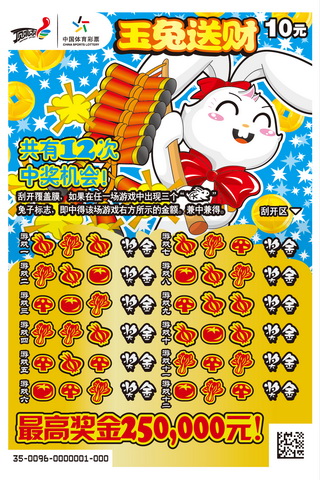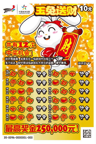 “玉兔送财”的票名很容易让大家想起近两年顶呱刮推出的新年贺岁票种“金牛报春”和“锦虎送福”,没错,“玉兔送财”正是顶呱刮为迎接兔年来临而推出的。“玉兔送财”票种3张为一个套系,有红、黄、蓝三种不同的票面背景色,活泼可爱的小兔子和富有中国传统特色的鞭炮、灯笼、对联等图案给票面带来了勃勃生机。该票种每张彩票有12次中奖机会,游戏方式则是以有趣的“寻找兔子标志”的形式呈现:刮开覆盖膜,如果在任一场游戏中出现三个兔子标志,即中得该场游戏右方所示的金额,最高达到25万元的奖金等待玩家的赢取。