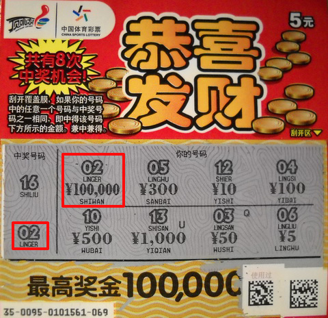 晓新这回认准了新票“恭喜发财”,说:“老板,给我换2张‘恭喜发财’,做生意嘛!新年就是要讨个好兆头。”他亲自动手刮了起来,当刮到第2张时,首个“你的号码”就是“02”,下面出现了“100,000”字样,并且是8个号码中最大的金额。晓新顿时心跳加速,不知“中奖号码”下隐藏着什么悬念?他再次小心翼翼地刮开“中奖号码”,第2个居然就是“02”,对应了起来。“咦!这是多少啊?怎么好多零,是100吗?”女友说道。但见晓新激动地蹦了起来,大声说:“什么100,你以为是小数点啊!这是实打实的10万哪!老婆,我太爱你了!”