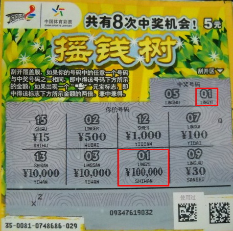 他学着别人拿起硬币刮起来,刮最后一张时,他先刮开了8个“你的号码”一栏,最后才刮“中奖号码”,全刮开后仔细一一对应,发现有个“01”上下相符,他再小心翼翼刮开“01”下方所示的金额,哇!怎么好多“0”?数了下,足有5个耶!小屠赶紧把彩票给大伙儿验证,大伙惊呆了,这可是10万元大奖,一点不差啊!