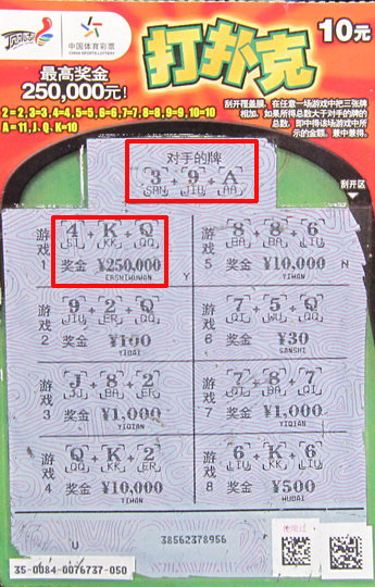 “我一共就买了两张彩票,这第二张就中了。”略显沉静的小王(化姓)说, 23日下午,自己闲来无事,本来想去网吧上会儿网,但这时正好看到附近有家体彩投注站。他心想,还是去买几张顶呱刮试试运气,毕竟已经好几天没有刮了,心里痒痒的。进入相城区黄埭镇青龙街505376站点后,小王要了两张“打扑克”刮了起来,这第二张彩票的第一个游戏就送出了25万元奖金。
