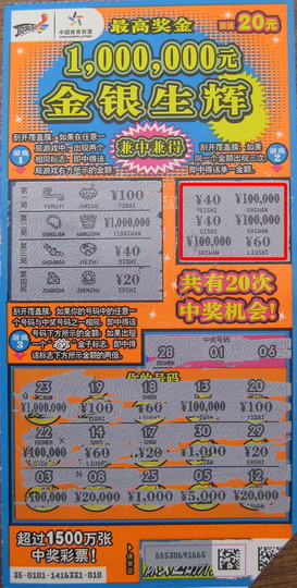 刚刚在连云港上市两周多的顶呱刮重量级选手“金银生辉”,以其亦真亦幻的票面设计和丰富多彩的游戏内容,征服了广大顶呱刮爱好者。“此地有银百万两”一时间传遍了港城的大街小巷,很多顶呱刮爱好者纷纷慕名而来。“金银生辉”视觉效果很给力,送奖更是给力。