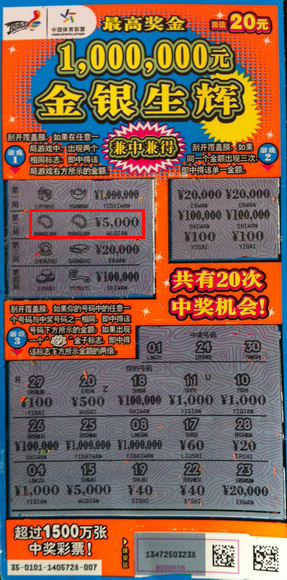 “金银生辉”上市以来引起一阵又一阵的中奖热潮。20天江苏省就有4位彩民幸运揽获百万大奖,其中就有一位南京彩民。而5000元奖金更是遍地开花,南京已有10位幸运者笑纳奖金,这也创造了南京即开彩票的一项中奖纪录。