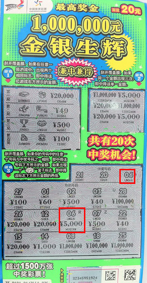 果然,在刮到第四张的时候,在经典的数字匹配游戏中,张先生刮出了与中奖数字“06”一样的数字,下面的奖金显示他中得5000元。“没想到还真的挺灵验的,看来以后要相信眼缘了,看上了就买几张,说不定大奖就在里面!”(南京 顾融)