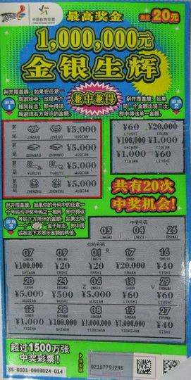 洪泽渔民老于(化名)就是其中一位幸运的掘金人。3月14日,老于在朋友的陪同下来到淮安市体彩中心兑取了他“挖出”的2万元“真金白银”。聊起中奖经过,常玩常中的老于显得很淡定。13日晚上,拥有几条渔船的老于在饭后来到了洪泽三河镇上的体彩店里,当时销售员向他这位老朋友推荐了中国首款荧光彩票“金银生辉”,喜欢尝鲜的老于就拿了一本,熟练地刮了起来。刮到第15张时,老于眼前一亮,游戏一区第一局出现了两个相同的金锁标志,老于心里一想,有了,多半又中20元,再刮开右边的覆盖膜,5000元!当开心的老于接着往下“挖”的时候,他有点纳闷了,怎么第二局又出现了2个相同的钱包标志,他翻过来看了看彩票背面的奖级设置表,难道这张票是2万?再次刮开右边的覆盖膜后,第二个5000元赫然出现在眼前。接下来的2局游戏,5000元!又是5000元!4个5000元,可不就是2万元嘛!