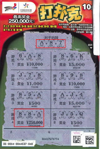当天,秦先生转进了一家体育彩票销售站,买了5张彩票,其中就包含了一张“打扑克”。再把彩票仔细认真地刮开之后发现,他发现游戏4中的三个数字相加是27点,超过了对手牌的26点,从而赢得大奖。回头一看奖金不得了,十足的25万元头奖。