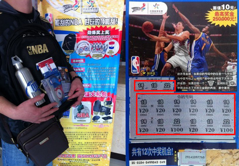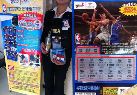 下午,一位女彩民走进南京市体彩中心——她也是来领取NBA特许产品运动礼包的。她笑着展示自己的中奖彩票:“你看,全是奖,光是数清楚我中了多少奖金,都数了很多遍。10元就中了800元,看来我运气不错。”