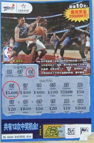 NBA 即开票在徐州上市以来,已有 60 余位彩民获得 NBA 特许产品。其中中奖彩民小张本来是冲着赢取 NBA 大礼包去的,却喜中 5000 元大奖! 4 月 2 日晚,小张在站点买完 7 位数后,听销售员介绍说,新上市的 NBA 主题即开彩票玩法新颖、中奖率高,而且现在还能参加“劲爆奖上奖”活动,不禁有些心动。小张平时就喜欢看 NBA 比赛,也喜欢买即开彩票,于是便买了 2 张 NBA 主题票,没想到当天就刮出一个 5000 元大奖,另外获得 NBA 大礼包一份!