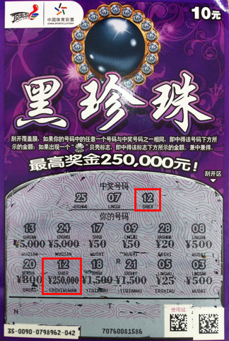 当然,冲动就要行动,行动也自然有了回报。5月19日傍晚,这位彩民照常购买了几张“黑珍珠”,当刮开第一张的覆盖膜,“你的号码”12和中奖号码之一的12正好吻合,下方显示中奖金额25万元。“看到这么多奖金,我就感觉自己心跳加速,也根本不敢相信。直到销售员帮我确定了之后我才慢慢平复了激动的心情。”