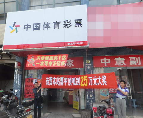 图为工作人员拉横幅庆祝站点中出大奖
