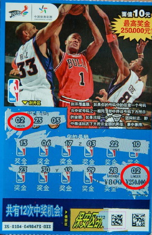 顶呱刮返奖率高,中奖容易,寓中奖于娱乐之中。当前顶呱刮NBA主题即开票在全国范围内热销,系列活动也在进行。截止到本月底,凡购买面值10元顶呱刮NBA主题票单张中得400元或以上奖级,就可获赠NBA特许产品运动礼包一套(含NBA概念双肩背包一个、NBA折叠耳机一个、NBA球队系列抽象不锈钢水壶一个、NBA经典护腕一个)。若购买5元或10元的顶呱刮NBA主题票没有中奖,也别忘记从即日起至
