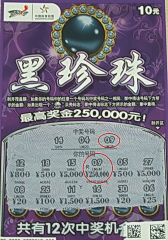 6月7日,大奖得主赵先生(化姓)中午休息的时候跟单位的两个朋友去餐馆吃饭,吃完饭,顺道去旁边的03371站点买彩票。赵先生平常非常喜爱“超级大乐透”、“7位数”这样的大盘玩法,这次像往常一样,买了当天开奖的“超级大乐透”。买完之后,看上班时间还早,朋友提议买点顶呱刮玩一下,赵先生没有买过顶呱刮,所以就坐在旁边等着,看着两个朋友一张接着一张刮,很是起劲。朋友看他坐着无聊,就提议让他也刮一张玩一下,还开玩笑说:“你是新手,手气肯定好”。他其实早就手痒了,经朋友这么一说,就拿起了销售柜台上一张“黑珍珠”,付了钱,边看彩票上的说明边刮,第一张没有中。于是又跟销售员要了一张,当看到刮开区“09”与中奖号码“09”一致时,非常高兴,在看到奖金“250,000”时,简直不敢相信自己的眼睛,于是让销售员给他确认一下,经确认后,才相信自己中奖了。