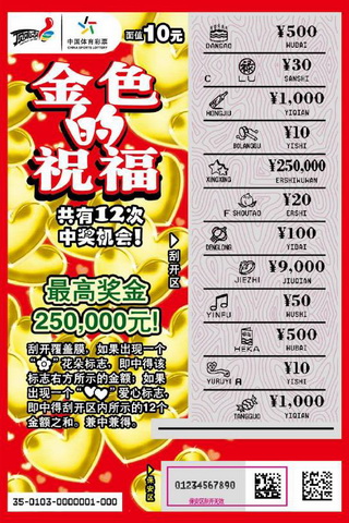 即开型体育彩票“顶呱刮”又添新丁,“金色的祝福”于近日登陆我省彩市。该票单张面值10元,共有12次中奖机会,最高奖金25万元。感兴趣的朋友,可至全省各体彩站点购买,在这个绚烂的夏天畅享这幸运多彩的祝福。