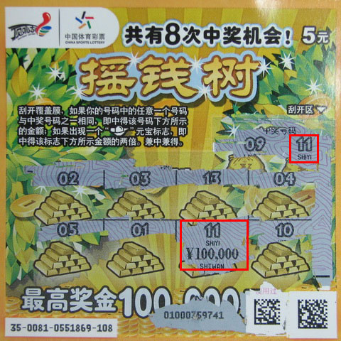 摇钱树是神话传说中的一种宝树,摇摇它就会落下金钱来。神话传说当然只是虚构的,但即开型体育彩票“顶呱刮”却能让您亲眼见证“摇钱树”带来的财富,轻轻一刮,大奖就会到手。6月22日,这样的幸运降临常州新闸新昌路298号04087体彩销售点,李先生(化名)喜获“摇钱树”十万大奖。