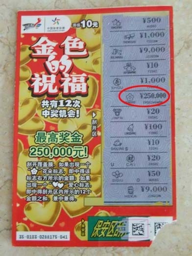 据悉,中奖当天,小陈到朋友家玩。他的朋友也是彩民,两人见面后就相约一起去体彩店购彩。进体彩店后,他首先买了几期11选5,中奖以后,就转战“顶呱刮”。当他看到销售台上展示的“金色的祝福”即开票后,随即让销售员给他拿了5张,小陈看到票面感觉非常亲切。他笑着说:“金色的祝福,刮一刮,福来到”,刮了三张后,金色的祝福真的变为现实,竟然有二十五万大奖掉下来,“我现在才回过神来,仿佛在梦中。”