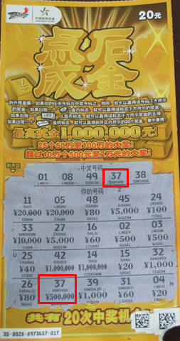 据中奖者小李(化姓)说,他是一位资深彩民,对体彩大乐透“情有独钟”,每期要买几十元钱的小复式,而且每次都要买上几张体彩的“顶呱刮”碰碰运气。那天看到站点摆放的即开票“点石成金”,随即开始刮,先是刮了两张没有中奖。于是他叫销售员拿出全部“点石成金”的彩票,随机从中间挑出一张买下继续刮。当刮到最后一行时看到你的号码“37”与中奖号码“37”相同,心中暗喜,当刮开中奖区时票面露出一个“0”,再往前刮,又是一个“0”;再轻轻往前刮,还是一个“0”……到最后共计刮出五个“0”时,小李一时不敢相信自己的眼睛,再次确认后,才确定自己中了50万的大奖。