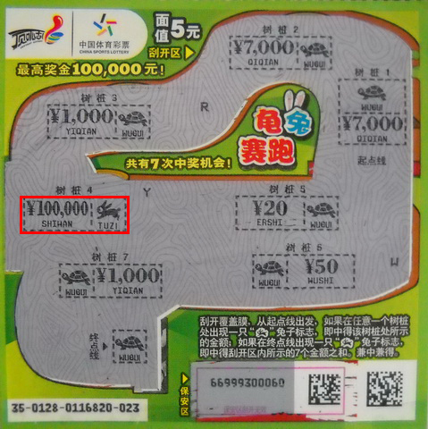 小沈先要了一张“20倍幸运”,刮开中了20元,又换了4张5元票“龟兔赛跑”刮了起来。前几张就已是小奖不断,当刮开手中最后一张“龟兔赛跑”时,“树桩4”处竟然藏着一只兔子,而这只兔子正朝着¥100,000迈进呢!这种以前总是在报纸上看到的好事情竟然落到了自己的头上,小沈起初还不太相信,随后他马上给站点业主核对,当确认手握的是10万大奖时,他顿时感到浑身来劲儿,开心得饭都顾不上吃,迅速奔回家报喜。(常熟:唐莉)