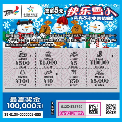 从票面可以看出,“快乐雪人”是一款不折不扣的“圣诞票”,整个画面洋溢着节日的气息。该票每张售价5元,共分9个奖级,有8次中奖机会,最高奖可达10万元。刮开覆盖膜,如果出现一个“手套”标志,即中得该标志下方所示的金额;如果出现一个“围巾”标志,即中得该标志下方所示金额的五倍;如果出现一个“雪人”标志,即中得刮开区内所示的8个金额之和。兼中兼得。