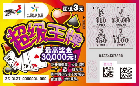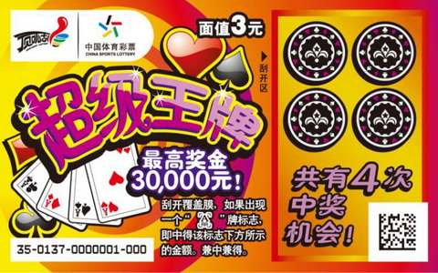 “超级王牌”是近期以来体彩即开发行的第一款3元票,共分10个奖级,有4次中奖机会,最高奖3万元。该票游戏规则简单明了,类似曾经红极一时的“红樱桃”。扑克牌中最大为“A”,所谓“超级王牌”就是一个寻找“A”的游戏。刮开覆盖膜,如果出现一个“A”牌标志,即中得该标志下方所示的金额。兼中兼得。(郑俊春)