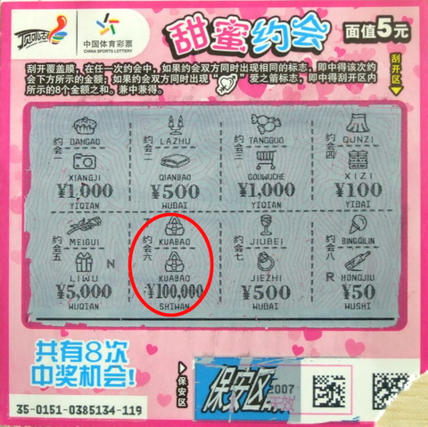 2月9日,徐州市体彩中心兑奖大厅迎来了一位30左右的年轻人,经采访,他是来徐打工的外地彩民。8号晚上,吃过饭后小伙子习惯性地到站点想买几张彩票,销售员推荐的情人节新票种“甜蜜约会”,具有立意新颖、简单易懂、即开即中的特点,于是他花了点小钱,向销售员买了两张,便在店内刮了起来,很快,便中到了30元。随即,小伙子就让销售员再换成6张。谁都没有想到,这10万元的大奖就“隐藏”在这6张票中。当他刮开票面,看到相同的“挎包”图案下面赫然写着“100000”。小伙当时也不敢相信会这么轻易中到10万大奖,便让销售员帮忙核对自己是不是中到了100元。当被告知中得的不是100元而是10万时,小伙才确认自己真的是中到了大奖了,并表示情人节一定给女友买个心仪的礼物。
