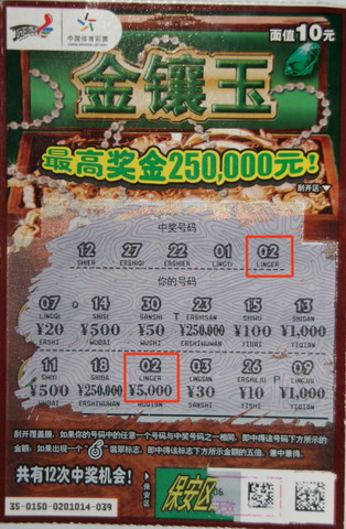 前几天,小江来到体彩店发现又上了几款新票,“金镶玉”一下子就吸引了他,小江说珠宝系列的彩票不仅名字喜气,更有富贵之气,他先刮了一张,没有中奖,于是又刮了一张,结果好运喜至,刮出“02”与开奖号码相同,下方所示奖金为5000元。