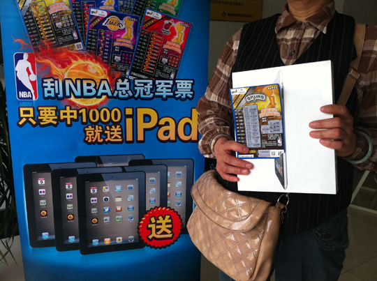 中得 1000 元就能额外获赠 iPad ,这也是王先生刮“ NBA 总冠军票”的原因之一,他表示,现在苹果产品已经成为一种时尚,现在轻轻松松刮体彩“顶呱刮”就能中得一个,也是很幸运的。