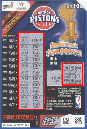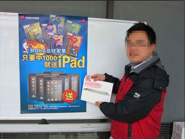 4 月 9 日,“刮 NBA 总冠军票 中 1000 就送 iPad ”活动首日,昆山苇城南路新江南大厦 05400 站点一彩民中出 1000 元奖金,同时获赠苹果 iPad 一台。