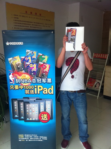 体彩顶呱刮“NBA总冠军票”中1000就送iPad的消息一传开,整个南京城就掀起了一阵热潮,“NBA总冠军票”一度供不应求,iPad也送得不亦乐乎。来自南京的一位小伙子早有购入一台iPad的打算,知道有了这个活动就走进体彩店,没想到第一次出手就梦想成真。