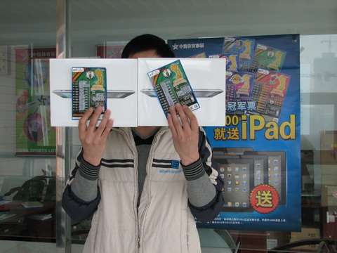 4月9日以来,NBA总冠军票携iPad以所向披靡之势席卷龙城,让彩民朋友的刮奖劲头空前高涨。4月16日和17日,常州彩民姜先生连续两天到体彩中心领取奖品,2台iPad到手让他乐得合不拢嘴了。