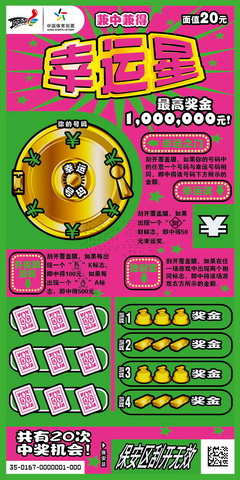 “幸运星”每张20元,共分10个奖级,有20次中奖机会,最高奖可达100万元,该票二等奖也达到了10万元。整个票面的色调以红绿色为主,由于是荧光票,所以相当抢眼,票面分为四个游戏区,分别是幸运之门、幸运奖、扑克牌游戏、捡财宝。各奖项兼中兼得。 而“幸运”成为整个游戏的主题,当你叩开幸运之门之际就开始了自己百万大奖的寻宝之路。