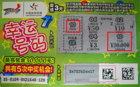 6月22日星期五,晚上七点多,张先生像往常一样去了东张乐苑路55855彩票店,先是买了几张“幸运星”,中了小奖又换其他票,就这样不断的轮换着,真是趣味无穷。后来,销售员向他推荐了3元票种“幸运号码”,“因为还剩最后四张,说不定大奖就在里面呢,你可以尝试一下。”张先生四张都要了,好运也在不经意间悄然而至。当他刮到编号为120的那张,“幸运号码”和最后一个“你的号码”相同,均为号码“10”。起初,张先生粗略一看,以为中了3000元;于是交给销售员确认,想着当场就能把奖金给兑了。谁知,销售员向他连声道喜:“你中的是3元票种的最高奖项,奖金足足有三万元呢!”张先生接过彩票就往家跑了,别提有多兴奋。