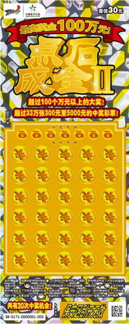 “点石成金Ⅱ”从颜色到款式基本保持原有版本特点,但在游戏设计上有了进一步的升级。其中“中奖号码”多达7个,而“你的号码”更是增加到30个,中奖机会由由原有的20次猛增至30次。该票每张30元,最高奖金达100万元。刮开覆盖膜,如果你的号码中的任意一个号码与中奖号码之一相同,即中得该号码下方所示的金额;如果出现一个“元宝”标志,即中得该标志下方所示的金额;如果出现一个“宝石”标志,即中得该标志下方所示金额的五倍;如果出现一个“宝箱”的标志,即中得该标志下方所示金额的十倍;如果出现一个“宝盆”标志,即中得刮开区内所示的30个金额之和。兼中兼得。