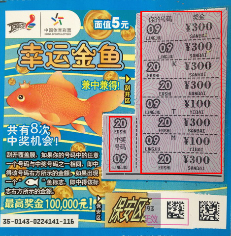 上周六的下午,天空淅淅沥沥下着小雨,店里就小蔡和一个“11选5”守号的彩民,俩个人闲聊着无趣就想刮几张即开票打发打发时间。彩民一眼就看中了柜子里的“幸运金鱼”于是俩人一人拿了十张,彩民一口气刮完竟然中了100元,小蔡拿起钢蹦儿晃晃,对彩民:“我有感觉,我这十张肯定中的比你多。”小蔡刮奖有个习惯就是先把数字刮出来再刮后面的奖金,他的感觉还真是不错,第一张刮开来就看到数字全中了,小蔡心想这下真钓到大鱼了,刮开后面的奖金一共是2000元。