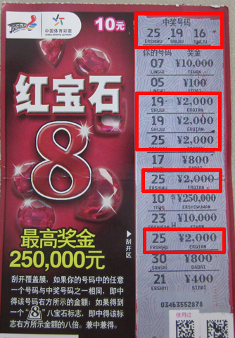 周先生刮开的中奖号码为“ 25 、 19 、 16 ”,一路往下刮,“你的号码”里居然有 3 个“ 25 ”, 2 个“ 19 ”,而且数字右边对应的奖金都是 2000 。这样加起来,足足中了 1 万元。