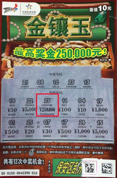 7月24日一早,小刘就来到了体彩中心,这次小刘中得的是“金镶玉”的25万元大奖,虽然略显羞涩,但小刘的眼睛中还是透漏着兴奋,他表示,每天都会买几张彩票刮刮,小奖从来不断,可是25万的大奖,着实吓了他一跳,第一时间竟不敢相信这是真的!小刘反复数着25后面的几个0,在加上销售员的再三确认,小刘总算相信这从天而降的喜事,第二天在热情的销售员的带路下,一早就前来领奖。