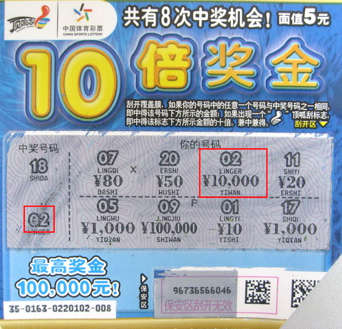 8月6日下午,小孙路过位于清河区西宁路一区九排万福巷的08148站点,听着空调外机轰轰地响着,他停下了脚步,打算进去凉快凉快。坐了一会,小孙感觉舒服多了,看着销售柜台里的顶呱刮,他想试试手气,于是给了销售员20元,销售员拿了就近的4张“10倍奖金”给他。接过彩票,小孙开始刮了起来,刮到第3张时,他停了下来。原来在“你的号码”中出现了和“中奖号码”一样的数字“02”,再看下方所示的金额“10000”,小孙激动万分。