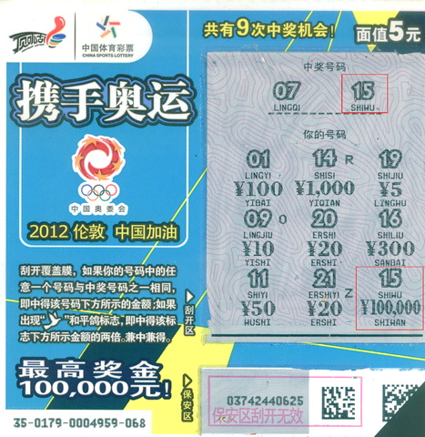 8月14日,中奖彩民王先生(化名)来到扬州市体彩中心领取了奖金。闲聊中,王先生打开了话匣子。他说,自己是体育彩票的铁杆粉丝,每天必买11选5、大乐透等玩法,也经常买些即开彩票。中奖前一天下午,王先生来到高邮三垛镇邮兴路的10893站点,研究了一下走势图,买了几十元大乐透。准备回家的时候看见即开柜台里有新票“携手奥运”,就顺手买了10张开始刮。10张刮完,中了一些小奖,就换了几张继续刮,其中一张刮出了和中奖号码“15”一样的号码,中奖金额部分他则从后往前刮,只见三个0,五个0,10万!王先生一下就喊了出来,“中大奖啦,10万!”