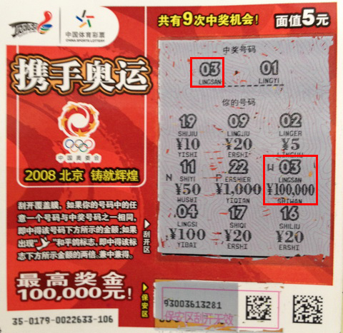 9月3日上午,一对夫妻来到常熟市体彩中心,领的是即开大奖,“携手奥运”头奖十万元。