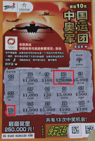 在NBA百万票火热销售的带动下,徐州的顶呱刮销售也进入了一个高潮。伴随着NBA特许产品大礼包的不断送出,其他票种也有大奖中出,“中国奥运军团”25万便是其中之一。