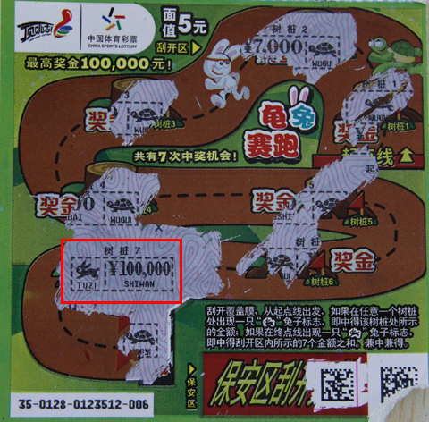 9月24日,他照常来到03471站点,先买了一张20元NBA主题票,没想到刮开后居然中了400元,按照活动规定,周先生额外收获一个NBA特许产品大礼包。当时他喜出望外,随即又让销售员拿了一张“龟兔赛跑”试试手气,先中了一个5元小奖,然后用中奖的5元钱又换了一张“龟兔赛跑”,没想到又刮出了一个兔子标志,奖金区赫然显示着“100000”。这下可把周先生乐坏了,“没想到今天运气这么好,幸运女神太眷顾我了!”