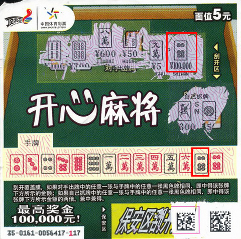 “大块头”小宇(化名)携妻儿在苏州做点小生意,空闲的时候喜欢购买体育彩票,每种玩法都研究,其中最喜欢“11选5”和顶呱刮,可以算得上是一位体彩达人了。9月25日午饭后,他像往常一样来到了梅花新村小区门口的05136站点玩起了“11选5”。在等待开奖的过程中,小宇买了20元的“开心麻将”,4张刮完都没中顺手扔进了垃圾桶。又买了两期“11选5”,他总觉得不对劲,仔细回想了下刚才刮的“开心麻将”,隐约有个“六饼”在像他招手。小宇也顾不上继续玩“11选5”了,赶紧冲到垃圾桶跟前翻找之前扔掉的4张顶呱刮。结果4张彩票都还在,检查到第三张的时候惊喜随之而来,果真“对手的牌”中有一个“六饼”,与“手牌”中的“六饼”一致,中奖金额显示十万元。当时他惊出一身冷汗,不禁感叹“还好,又找了一下”,就这样,小宇“捡回”十万元大奖。