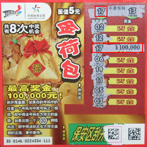 拿了两张“金荷包”彩票,老王心不在焉地刮起来,结果第一张刮出一个“17”与其中一个中奖号码相同,等他刮开后面的奖金区,老王一下子兴奋了起来,“中了中了,真中了!”一句话引得站点里的彩民都围拢过来,经大家一致“鉴定”:这张彩票中奖10万。老王高兴地揣起彩票,拉着销售员的手说,“多亏了你那句话,否则就真把大奖丢了。”