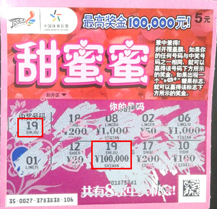 中奖者赵先生是个80后的小伙子,来常务工也有几个年头了,为人开朗,是7位数的铁杆彩民,偶尔也会买点顶呱刮。当问及中奖详情时,赵先生一下子打开了话匣子,他说到:“这次中奖真是一顿饭带来的意外收获啊。11月6日晚上,我和几个朋友想着聚聚,吃个饭什么的,就去了牛塘湖滨路的一家饭馆。饭局结束后,商量着去K歌,但是去哪家一直也没定下来,看着饭馆旁有家体彩销售点,大伙想着先进去坐坐,再商定吧。进去后看见几个人在那刮彩票,我就凑过去拿了两张甜蜜蜜刮刮。第二张就中了20元,看着中奖了,一下子兴致就来了,又拿了两张刮起来,到第四张时,刮出与中奖号码一致的‘19’,我赶紧刮开中奖金额,咋一看以为是1万元呢,再点了下,不对,是6位数啊,10万啊,我中了10万元啊!这顿饭吃的真是太值了,吃出了个10万块啊!”