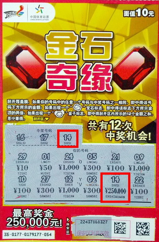 郭女士掏出10元告诉销售员随便给她拿一张即开型彩票,销售员就给郭女士推荐了10月底上市的“金石奇缘”。“这个票票面很简单,金黄的背景和红色的宝石就好像预示了好运气,而且很幸运的是我第一张就中了25万元。”