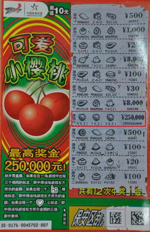可是更令人激动的却在10天后,12月28日,临近元旦新年,很多彩民都以恭喜发财相互祝福,李先生的站内,热闹非凡,大家回忆着过往、憧憬着未来。也是中午,周围人纷纷要回家吃饭了,当中一位中年男子说,买个小樱桃,带给闺女吃。该男子要了张“可爱小樱桃”就回家了,下午那位彩民过来咨询兑奖的事情,李先生方才得知,他的站点,再次被25万的幸运运砸中。李先生再次去门口挂横幅,陆续有过往相识的人开往笑说,李老板挂横幅挂上瘾了。但是一看游戏名称,许多人还是非常诧异,这样的好事怎么会这么快又发生。