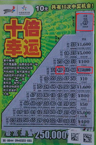 05645站点李先生介绍,2012年12月18日中午,一群在附近工厂上班的小伙子涌进他的投注站,之后各自要了一张自己喜欢的顶呱刮即开彩票。其中一位小伙子幸运中得“十倍幸运”25万。李先生喜气洋洋的挂了横幅,放了鞭炮,周围彩民和居民也纷纷聚拢来看热闹。