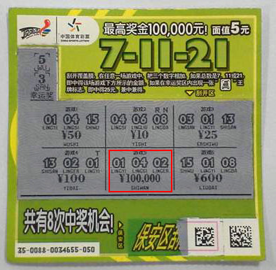 谈及中奖经过,90后小伙小张(化名)兴奋的说:“说起这个奖,完全是无心插柳,1月28日那天,我在蓝天市场买东西,看到彩票店就进去看看,随手要了几张即开票,刮中了几个小奖,销售员和我说,店刚开业不久,运气正是好的时候,不如再来几张张吧。我一想就几十元钱的事,碰碰运气吧,就让销售员拿了“7-11-21”给我刮,这一刮就刮出个头奖10万,今年过年真是行好运啦!”
